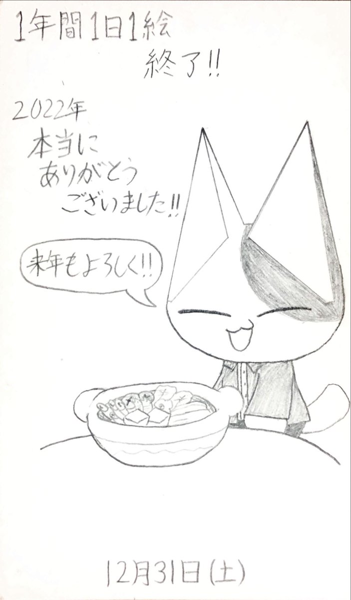 3 22 【1年間1日1絵】 12月31日(土) お鍋を食べるシュガトロ! これにて……1年間1日1絵終了です!!!!!! 思えば、僕が気まぐれに始めたこの目標……色々ありつつも、色んな方のふぁぼりつ、リプ等でモチベーションが続いたのでここまで続けられました! 1年間、ありがとうございました!!! 22/12/31 18:46