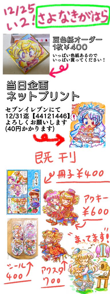 1 1 #ゆめジュエ 直前、また再三の告知失礼します。拡散頂いた皆様もありがとうございます。決定版のお品書きとネップリです。新しいものがないですが色紙は精一杯描かせて頂きたいです🙇【い2】にて君を待つ! 22/12/24 20:48
