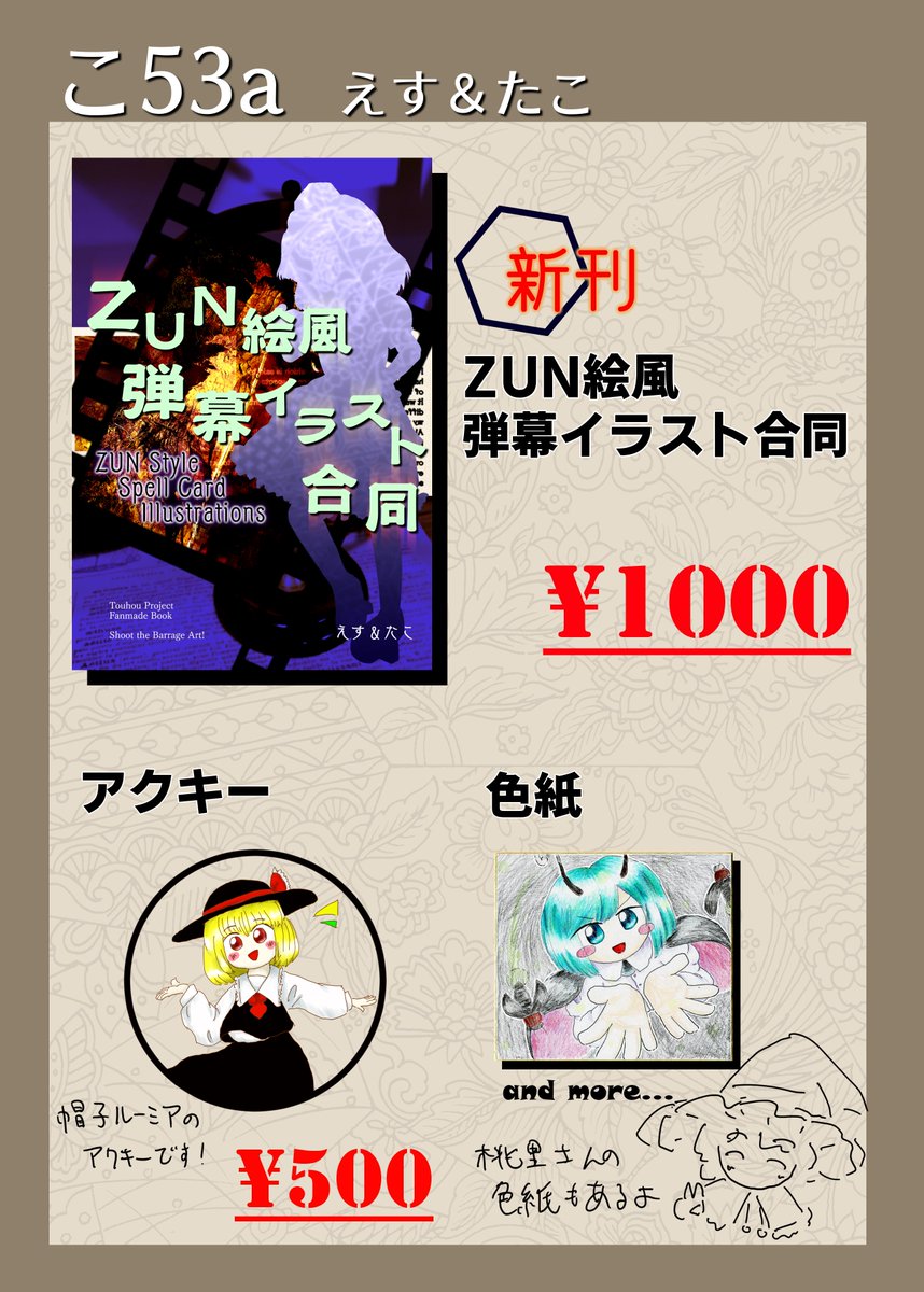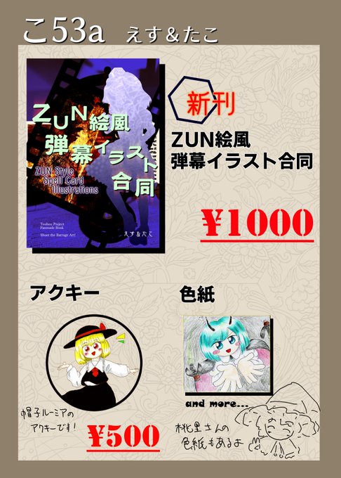 こちら春例のお品書きになります!! 新刊のZUN絵風合同とアクキーと色紙があります。 あと売り子として桃里(@210marisa)さんに居てもらうことになってます! 色紙はまだ1枚しか描けていませんができる分だけ描いて持っていきます!値段は未定です!(たぶん500円くらい)