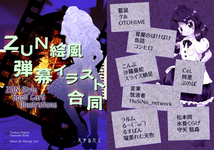 おしらせです!!! 5/7の博麗神社例大祭にて、ZUN絵風の弾幕・スペルカードイラストの合同誌を頒布します! 参加者総勢22名、フルカラー36pの本になってます! 前回のZUN絵風合同誌から4年、パワーアップした姿と参加者のみなさんのこだわりが感じられる素敵なイラストをご覧あれ…