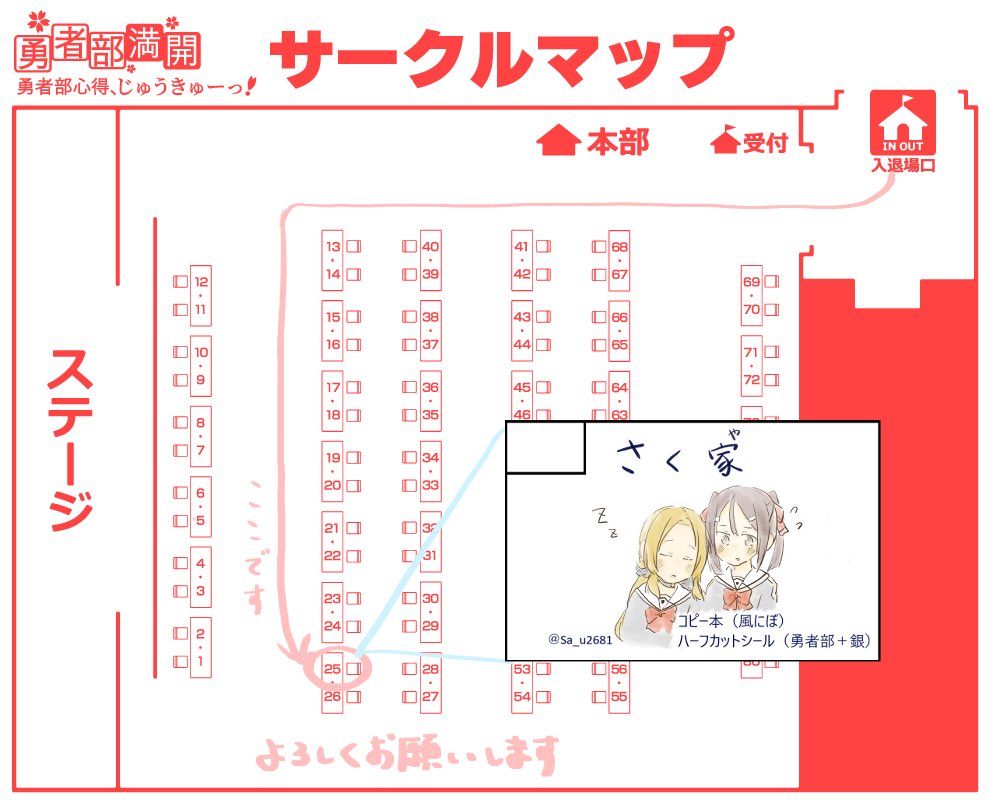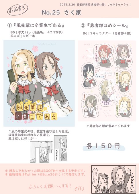 🌟告知&お品書き 2/20(日) 勇者部満開19 サークル「さく家」スペースNo.25で参加します!よろしくお願いします 頒布物:①漫画コピー本(風にぼ) ②ハーフカットシール(勇者部+銀) サークル一覧: sdf-event.sakura.ne.jp/mform/cutfile/…