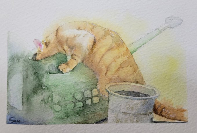 「よいっよいっ♪」 蛍光灯の色で全然色味が変わるなあ😳 こっそり顔付近に金色入ってます🤗 #猫 #サビ猫 #水彩画 #透明水彩