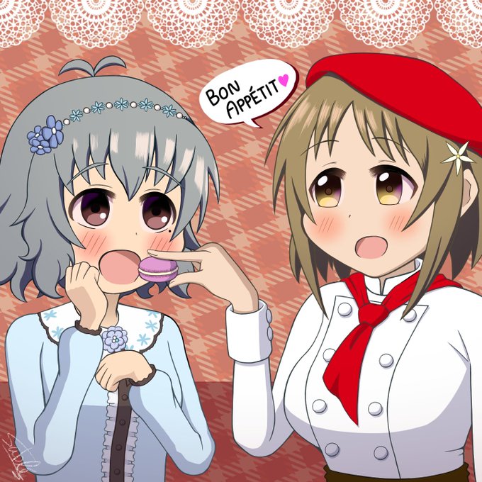 かな子からの差し入れはマカロンがいいですよね! ということで由愛ちゃんにマカロンをあーんしてあげるかな子を描きました!! #成宮由愛 #三村かな子 #SfC予選C #由愛は夢で終われない (トーナメント形式で勝ち上がっているので先日のとは *別の* アンケートかもです。よかったら確認してみてね) twitter.com/TaroImo312/sta…