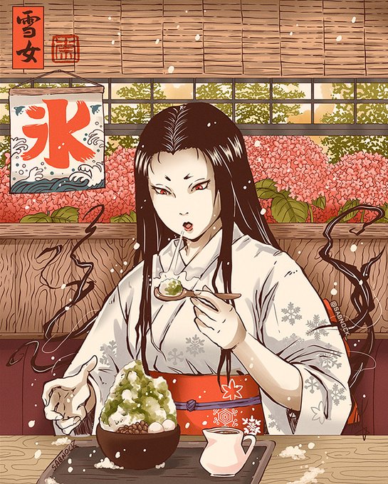 instagram.com/p/CgLbd2JM3TR/ A Yuki Onna eating matcha Kakigori (´∀`*)~✨🍧 #yokai #妖怪 #雪女 #art #イラスト #drawing #illustration #紫陽花 #hydrangea