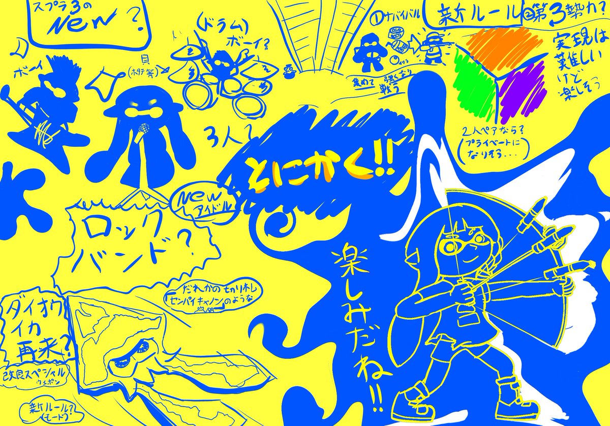 急いで描いたので雑ですが、22時から始まるスプラトゥーン3ダイレクトの予想図です。 ボーイのアイドルは来て欲しいと思っているけどどうなるのかな、 楽しみだね! #スプラトゥーン3 #スプラ3 #イラスト