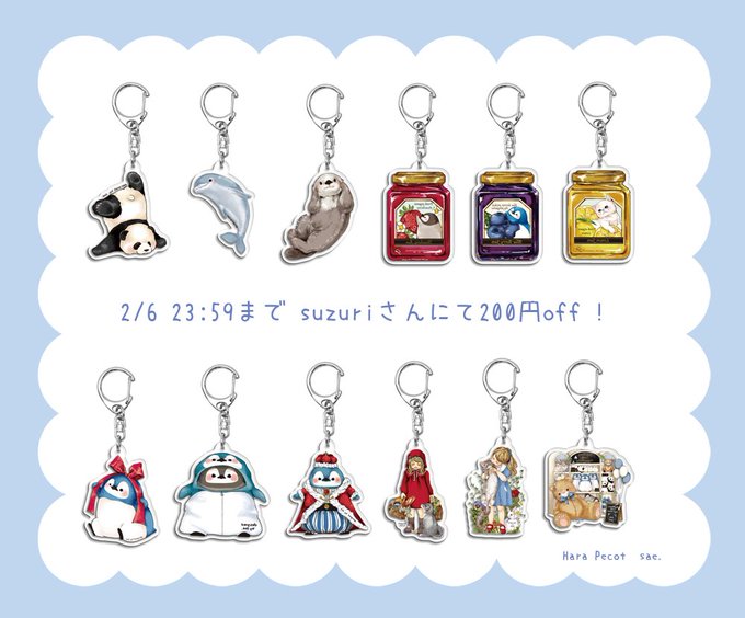 できたできたー!アクキー祭りだよー! どどーんと12種類✨ セール期間ギリギリになってしまいましたが2/6日まで200円オフのセール中です☺️ よろしくお願い致します💕 suzuri.jp/SaePecot/ #suzuri