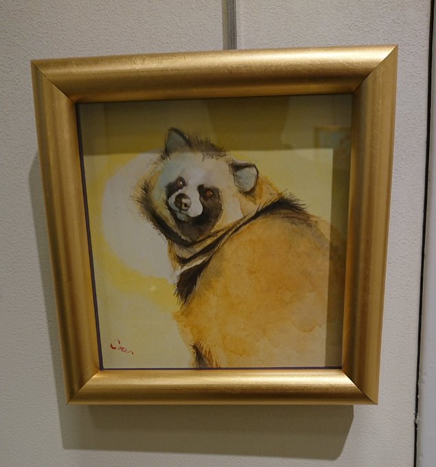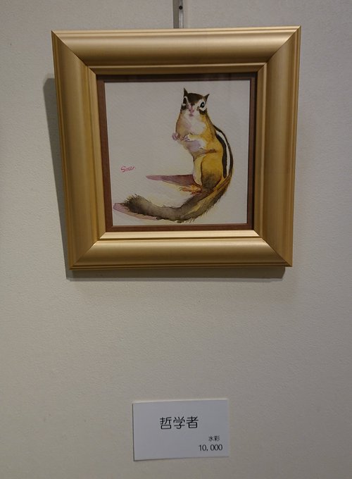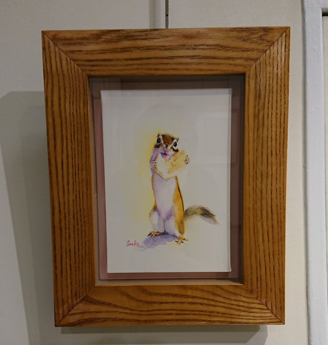 3 10 めでたくも嫁入り先が初日に決まったこちらの絵のモデルはkaz-e さん@daiwananatubosi 宅の大和くんです!かわいい、、、縦伸びして得意気にバナナ咀嚼中、、、 こちらもオリオンさん @orionwirgman の #アクリルデネブ です #シマリス #シマリス正面顔 #有楽町 #東京 #個展 #アート #水彩画 20/09/15 10:10
