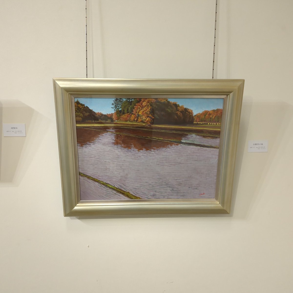 3 7 今回の案内状はこちらの作品です 「白驟雨のあと」 白雨も驟雨もにわか雨を意味する言葉で、それが二つ重なると強く大粒で降る秋の雨を表すそうです。 山は紅葉に色づいていて稲刈りも終わっている時期なのですが強い雨に見舞われ閑散とした田んぼに一時的に水がたまった瞬間を描きました 22/09/13 13:21