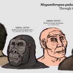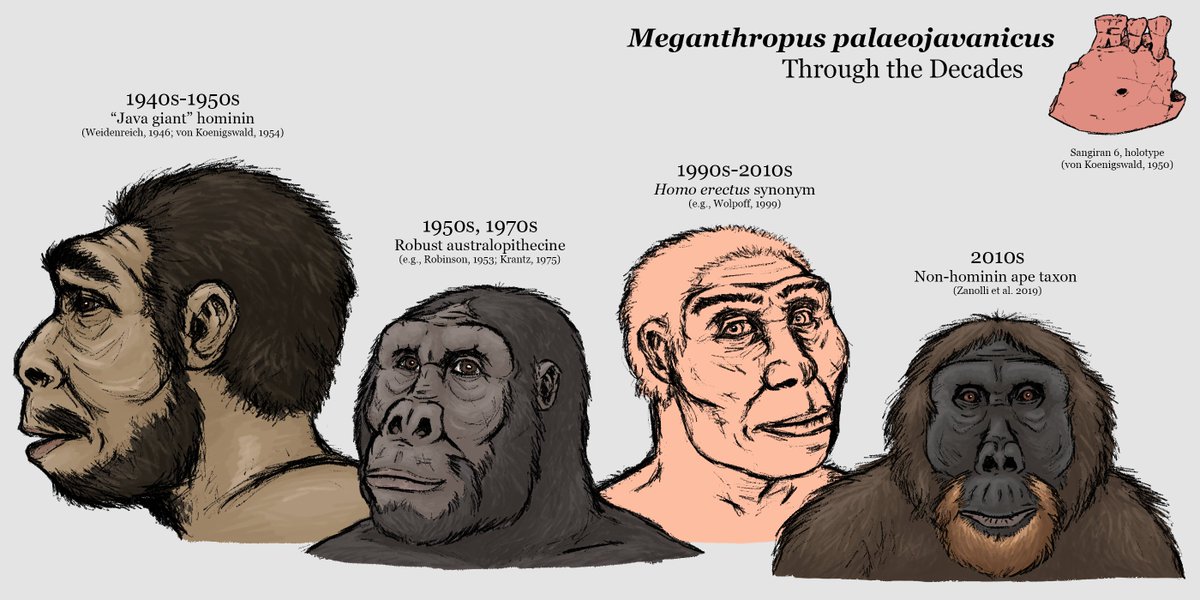 Represented by jaw frags. and teeth, Meganthropus is a taxon with a tumultuous history. First viewed as an unusually large (8ft) #humanancestor, now most see it as Asian H. erectus or a non-human #ape. #dinosthroughthedecades #paleoart #drawings #art #anthropology @jimmadseni