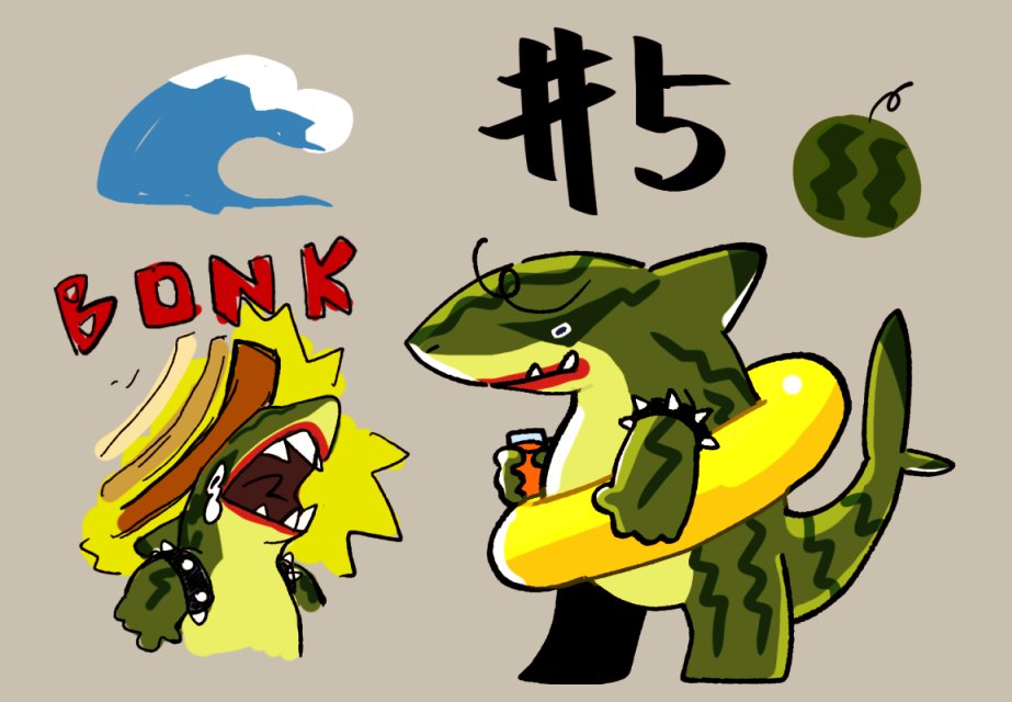 3 13 第5号: スイカザメ 波打ち際を散歩するのが好き。夏はスイカの代わりに殴られるので人間はきらい。ナメられないようにいかついアクセサリーを身に着けている。実は泳げない。 #一日一魚おえかき 21/11/24 15:06