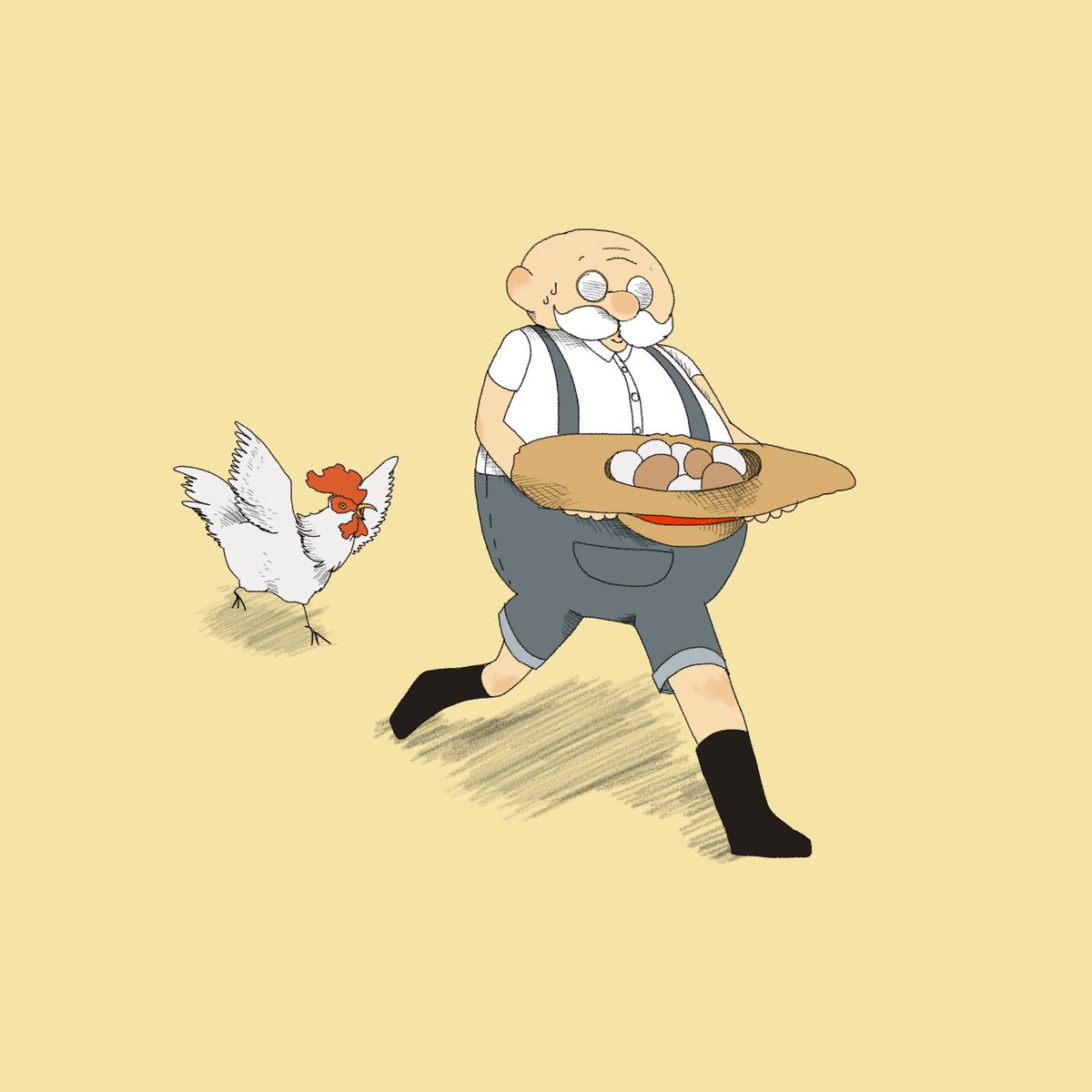 ペンの充電が切れたので 指描きの落書きです。 鶏に追いかけられるおじさん💨