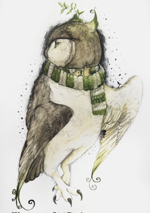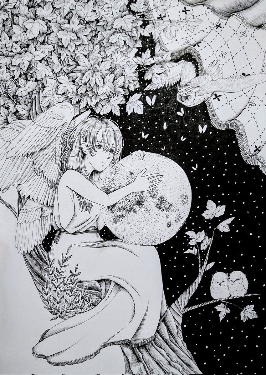 夜を抱いて🌕🦉 #イラスト #ペン画