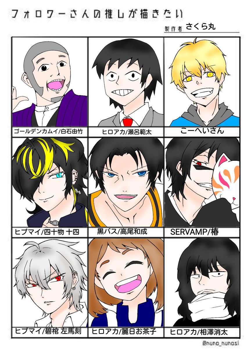 画力低いなりに頑張って描かせていだだきました! リクエストしてくださった方ありがとうございますm(*_ _)m 描いたことないキャラもいたのでとても楽しかったです( *´꒳`*) #フォロワーさんの推しが描きたい