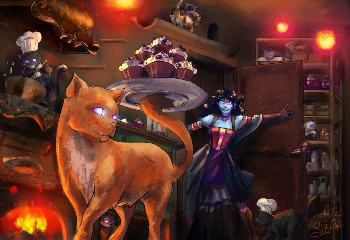 "You walk into a large kitchen that smells instantly of baking and pastries and cakes and cupcakes and pudding and sugars and there are cats everywhere." @VoiceOfOBrien you are a great storyteller. #criticalrolefanart @CriticalRole #jesterlavorre #widowgastsnascentnonagonaltower