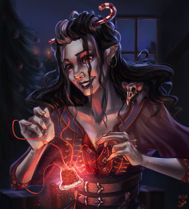Wishing all of you happy critmas with the amazing Laudna magically crocheting a little hat for Paté ❤️🎄 #criticalrolefanart
