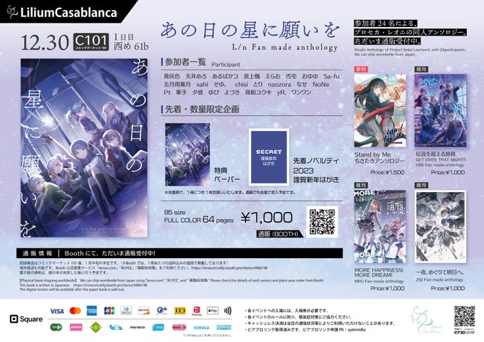 【#C101 新刊】 プロセカ・レオニアンソロを発行いたします! 参加者24名・フルカラー64ページ、流れ星に導かれ集った素晴らしい作品たちを、一冊にまとめあげたアンソロジーお届けいたします! C101 一日目西め61b、Boothにて購入いただけます! ↓ innocencelily.booth.pm/items/4406748 #あの日の星に願いを