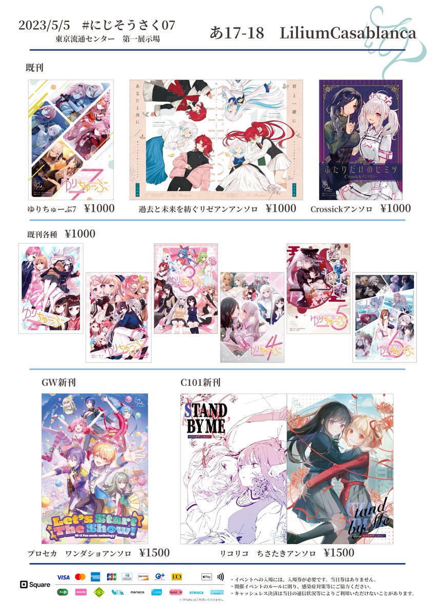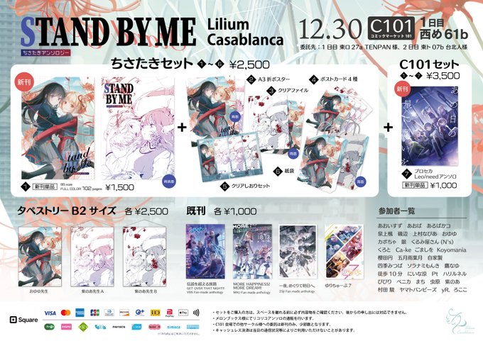 【#C101 お品書き】 コミックマーケット101のお品書きです! 一日目西め61b LiliumCasablancaでお待ちしています✨ 今回グッズセットもあります! Webカタログに詳細を記載していますので、ぜひチェックしてください❤️💙 webcatalog.circle.ms/Perma/Circle/1… #あの日の星に願いを #StandbyMeちさたき #リコリコ