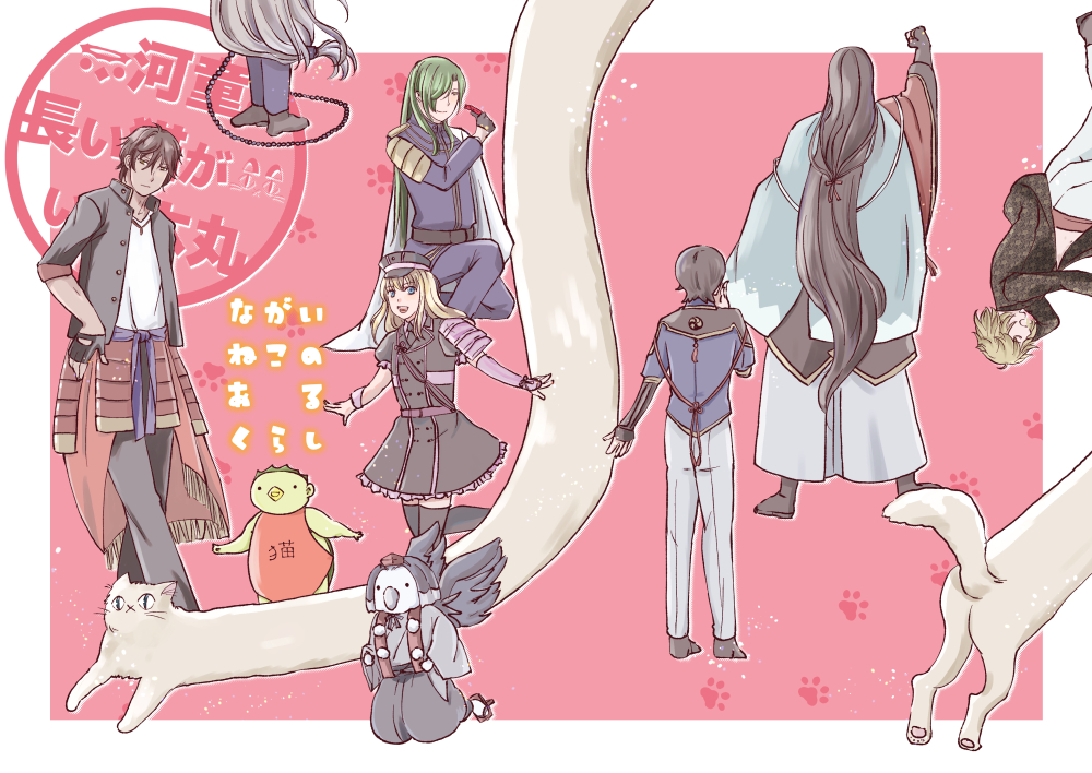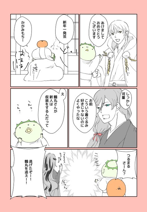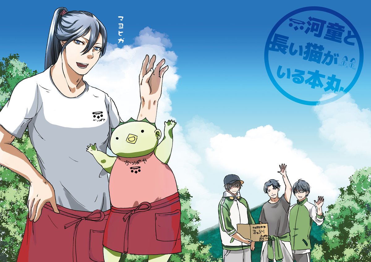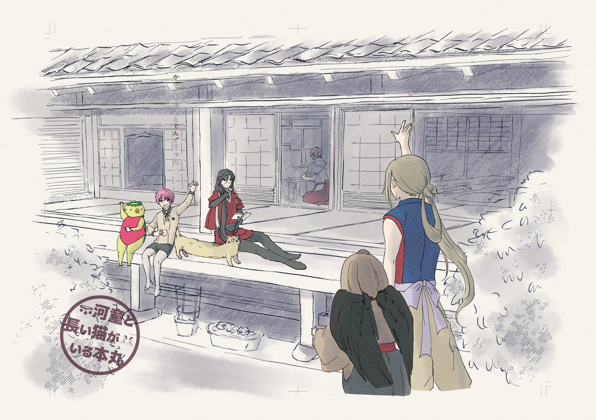 #3月になったのでフォロワーさんに自己紹介しようぜ 河童と長い猫がいる本丸の漫画やイラストを描いています。最近河童と長い猫のほかに天狗やぬらりひょんの怪異が増えました。怪異がたくさんいますが何もなくほのぼのと生活しています。