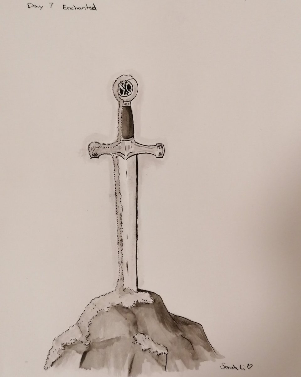 Inktober Day 7 Enchanted #traditionalart #inktober2019 #inktober #penandink #inktoberenchanted #art #enchanted #excalibur #stone #moss #sword #inktoberday7