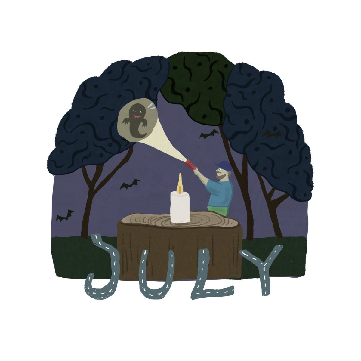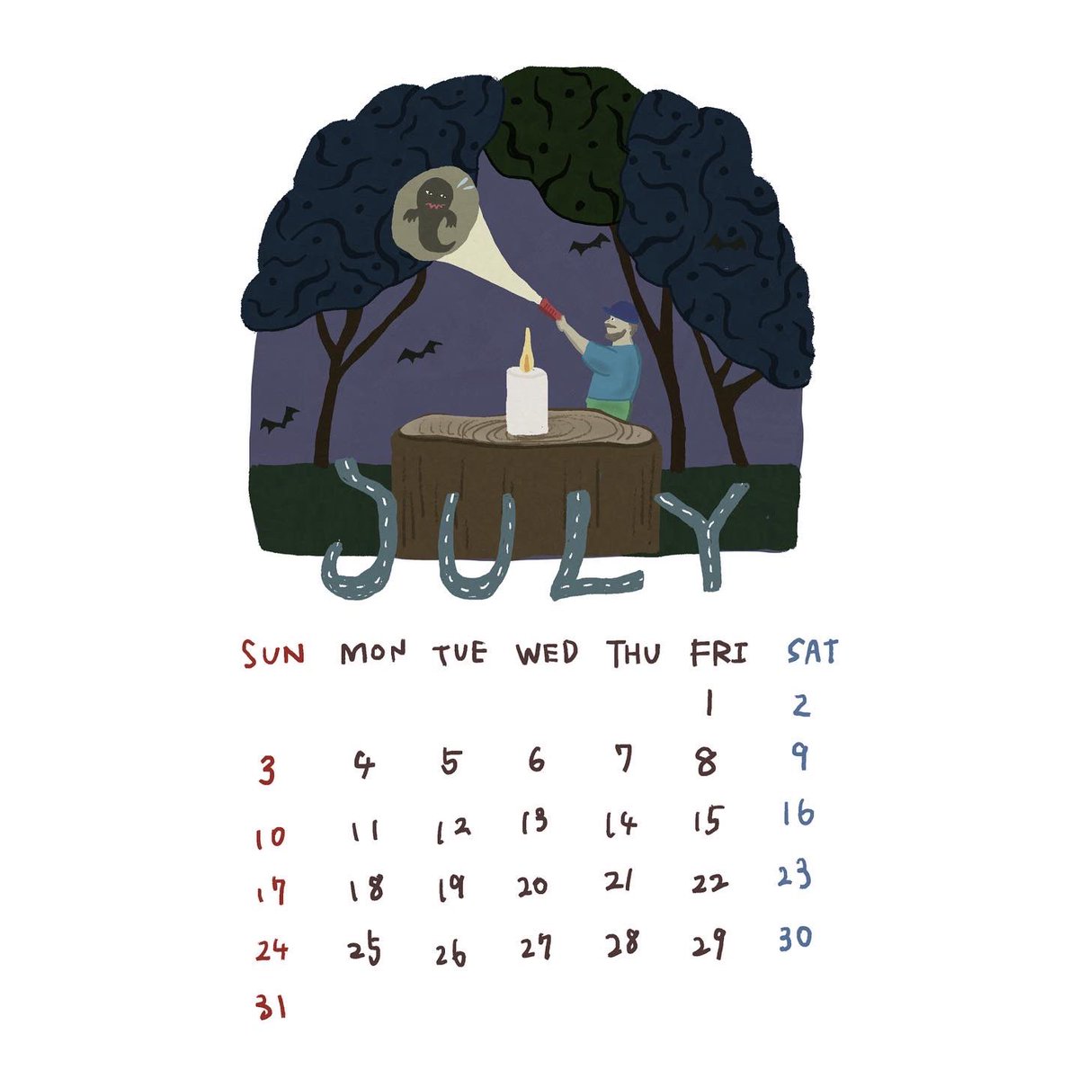 7月カレンダーは涼しそうな夜の森でアセアセするお化け🌿 #イラスト #イラストレーター