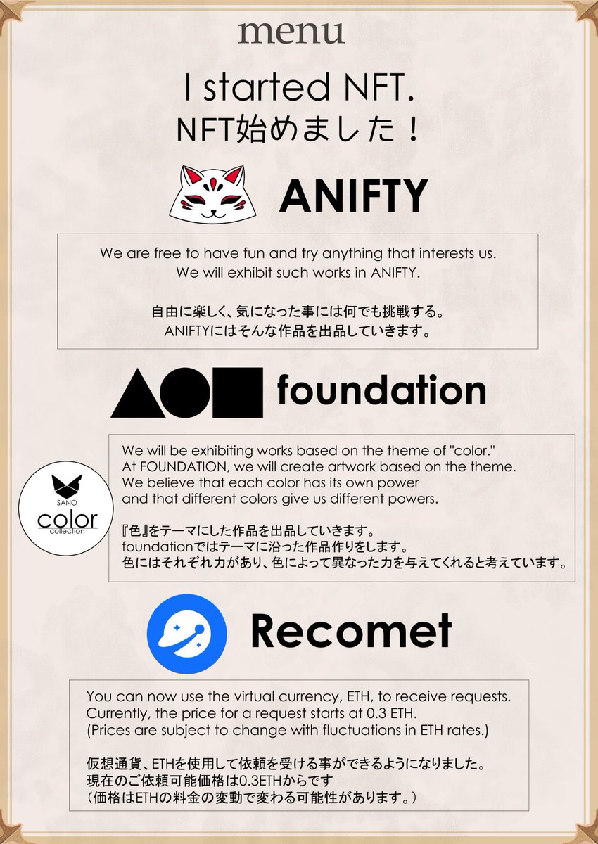 基本となる料金表が新しくなりました! イラスト依頼にご興味ございましたら是非どうぞ! booth→sasha-sann.booth.pm 【ご依頼】 ✉ →sanotosasha.0821@gmail.com twitterのリプ、DMまで 【NFT】 ANIFTY anifty.jp/ja/@sano#creat… ▲●■ foundation.app/@sano Rcomet recomet.io/@Sano
