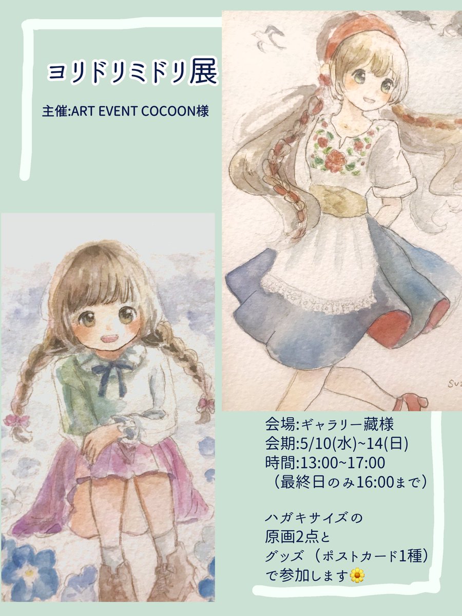 🌼お知らせ ART EVENT COCOONさま主催、#ヨリドリミドリ展 に参加します 会期:5/10(水)~14(日) 13:00~17:00(最終日のみ16:00まで) 会場:ギャラリー藏 (大阪・京橋駅) 緑・植物がテーマです 季節感のある絵を描きました🌿 お近くのかたはぜひに