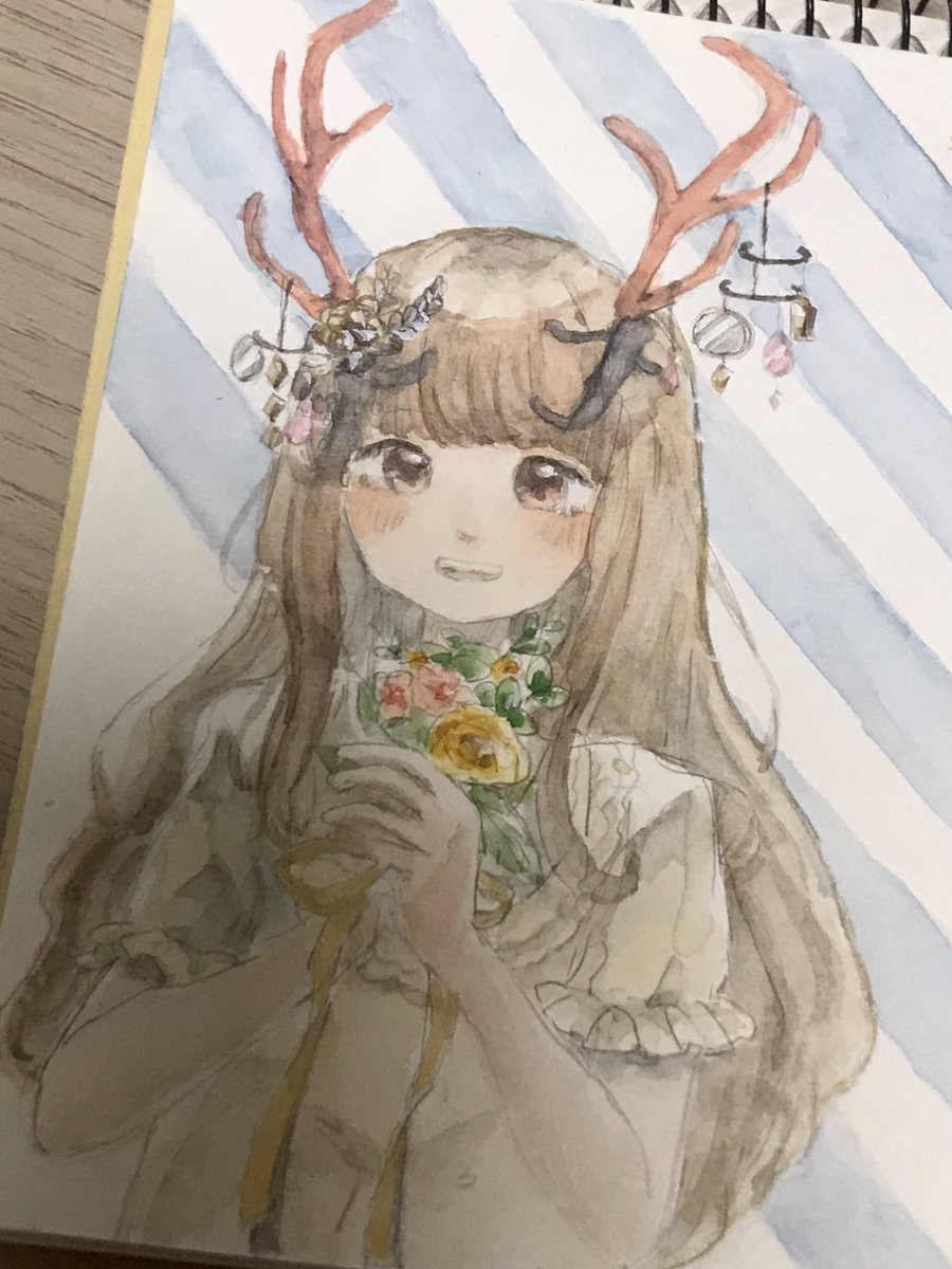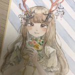#角の街 『〇〇には珊瑚のようなシカの角が生えていて、そこに色ガラスのモビールを吊るしています。瞳は赤い炎色で髪はココア色。天気の良い日は、金のリボンを結んだ手製のブーケを売り歩いています。』 🌿獏[@ tapir_zzz] さん作成の診断メーカーを元に描かせていただきました
