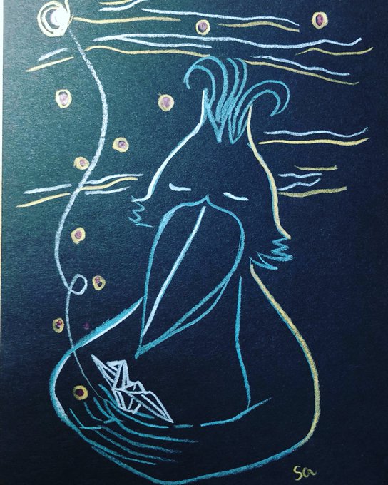 1 11 祈りの日 #ハシビロコウイラスト #色鉛筆 #折り紙 #鶴 #千羽鶴 #8月6日 #広島 #平和 #白 #星 22/08/06 18:47