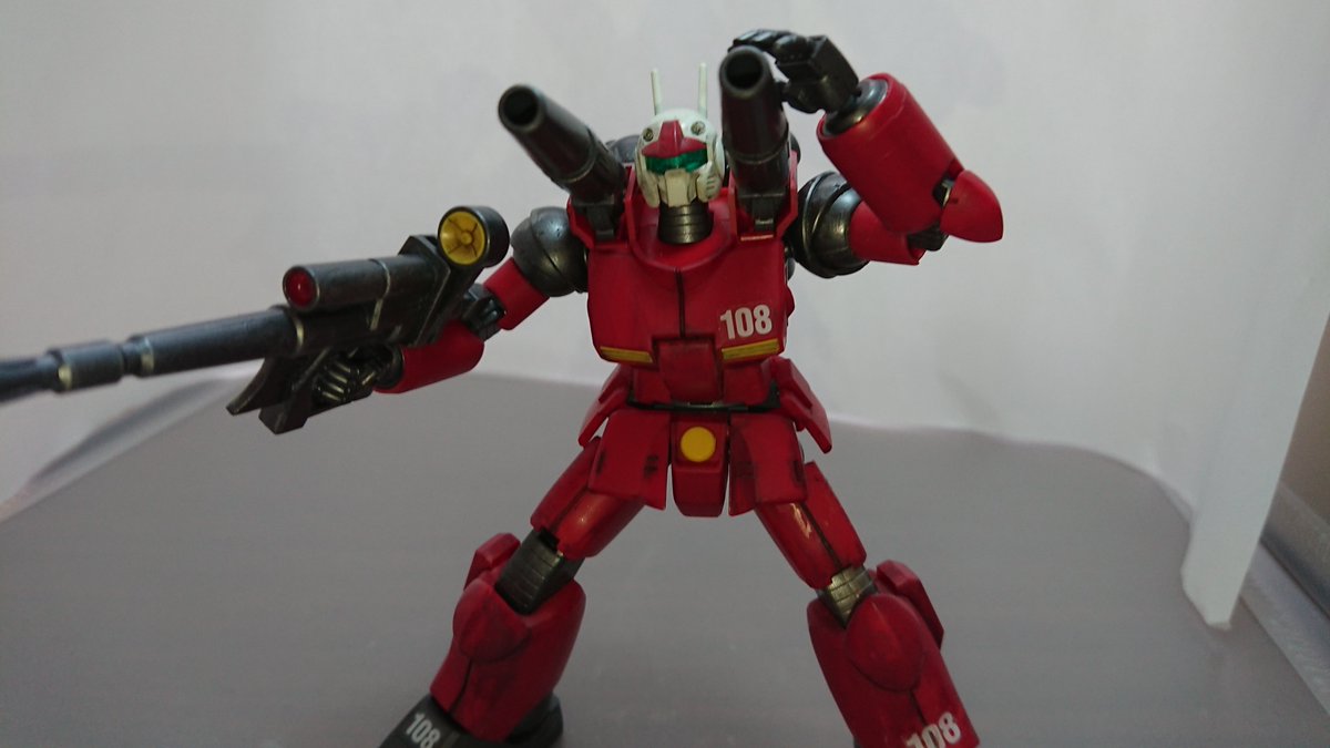 HGグフカスタム、ファレホの筆塗りで全塗装、今回墨入れくらいで汚さないで完成、デカールはモノアイだけ、3連装ガトリングのスコープは蛍光ピンクで塗装 #みんなでガンプラ #ガンプラの画像を貼るとRTされると聞いて #ファレホ