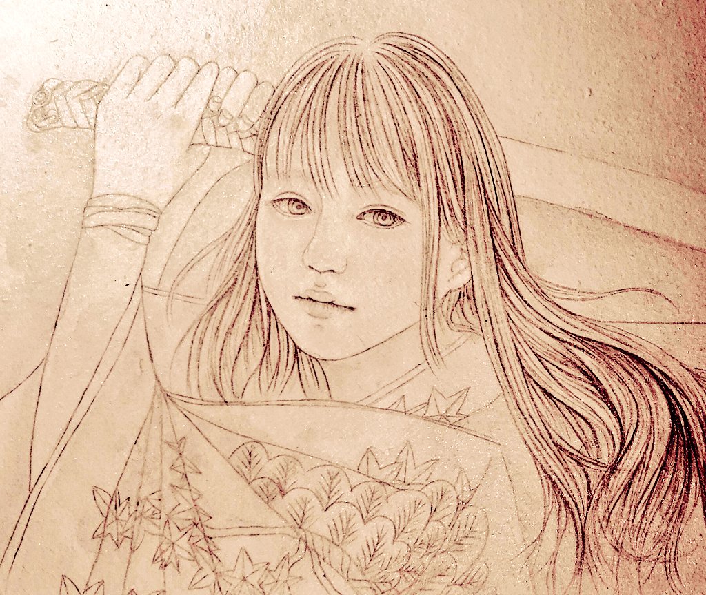 おはようございます🌞 骨描き完了!久しぶりにサムホールに描いてます。 #art #japaneseart #日本画 #墨 #着物 #kimono #女性 #hairstyle #illustration #イラストレーション #イラスト #artwork #線画 #絵描きさんと繋がりたい