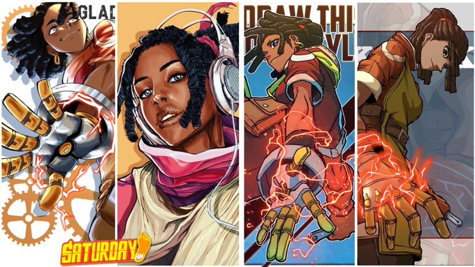 #Jamaica artist @designsunset is a finalist in our #MarchMadness2022 for #artists & could WIN the #ipad! Capturing a vision of SATURDAY WARS - our upcoming crossover event this is one of the #FinalFour #fanart that YOU CAN VOTE FOR. Do so at saturday-am.com/madness