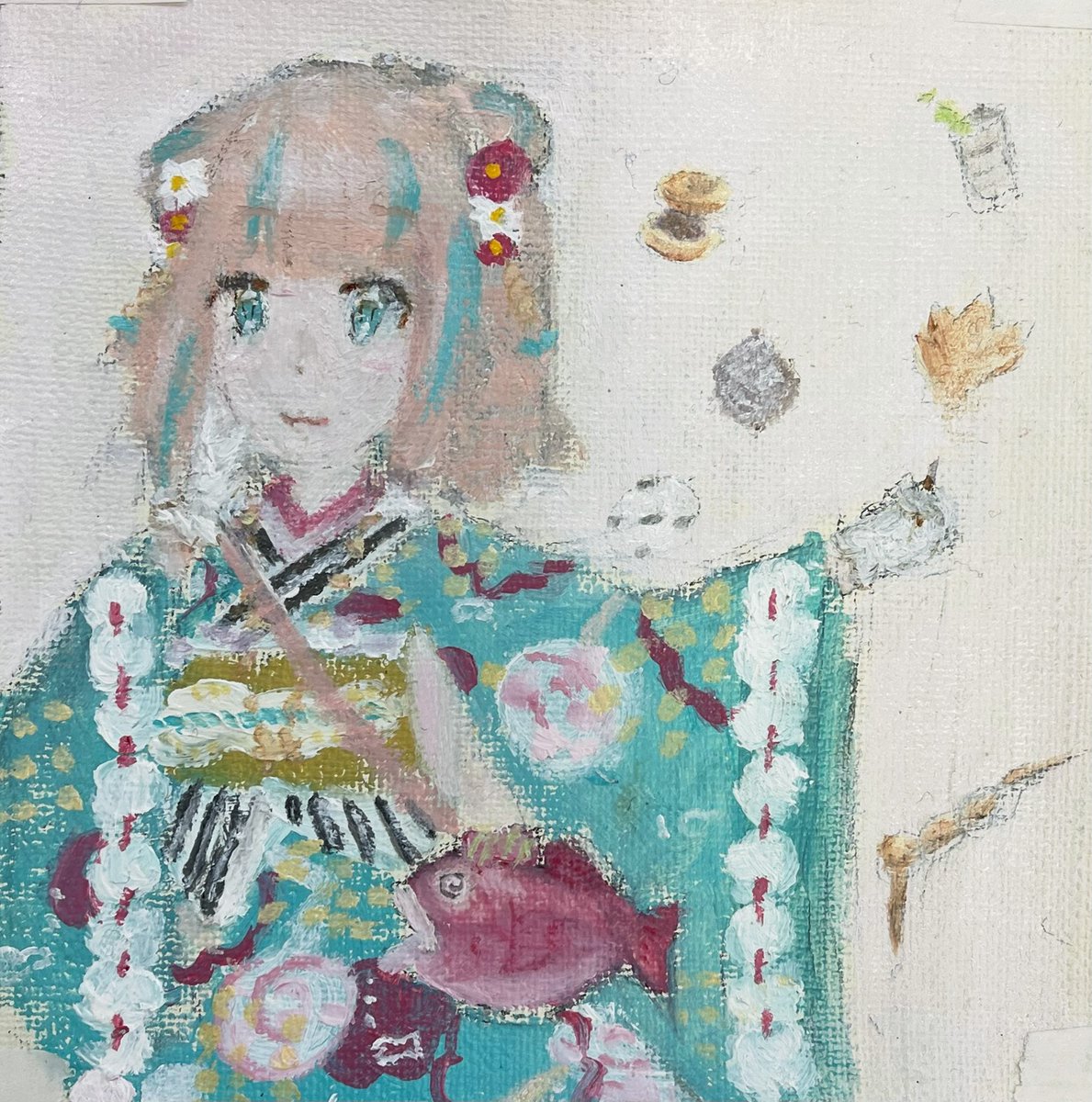 6 12 授業で描いた油絵かなうん!🐟 加筆するかもだけど、一旦完成ということになったので投稿! あんこの色難しかった…🫘 あんこに見えますか…? #夢川描いたよ 22/12/06 20:30