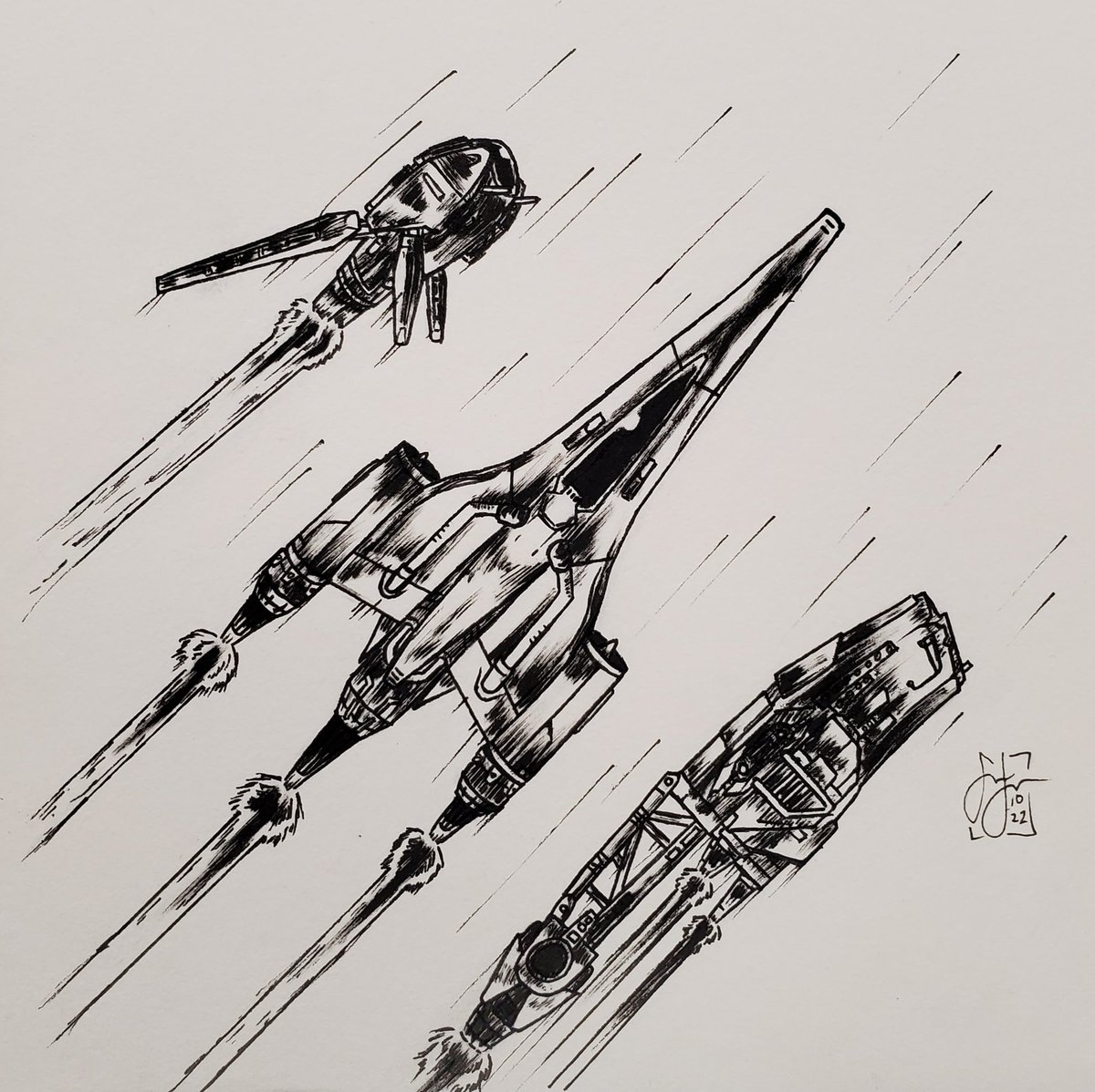 #Inktober Day 7: Trip From top to bottom, the personal ships of Hestia, Pixel-3, and Astraea sail across the sea of stars. Fireteam Ares is on the hunt. 🚀 #Destiny2Art #AOTW