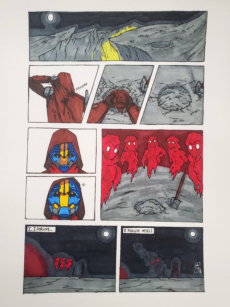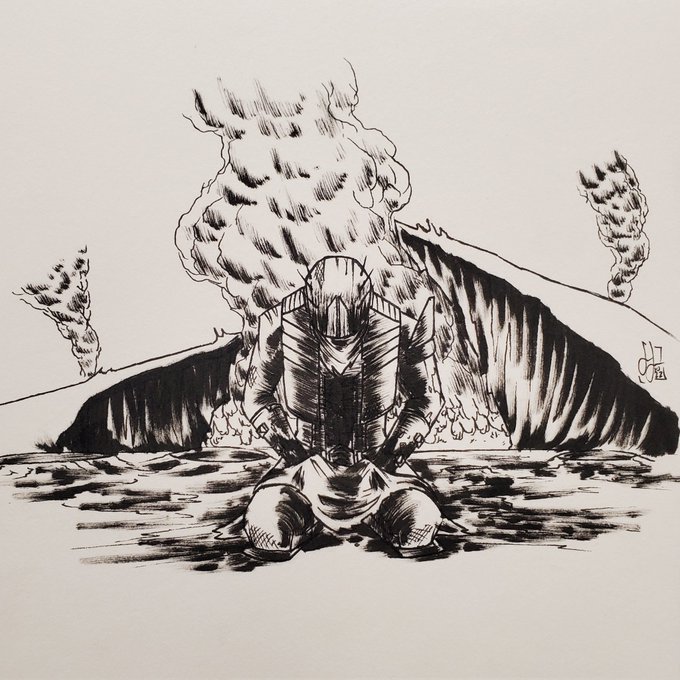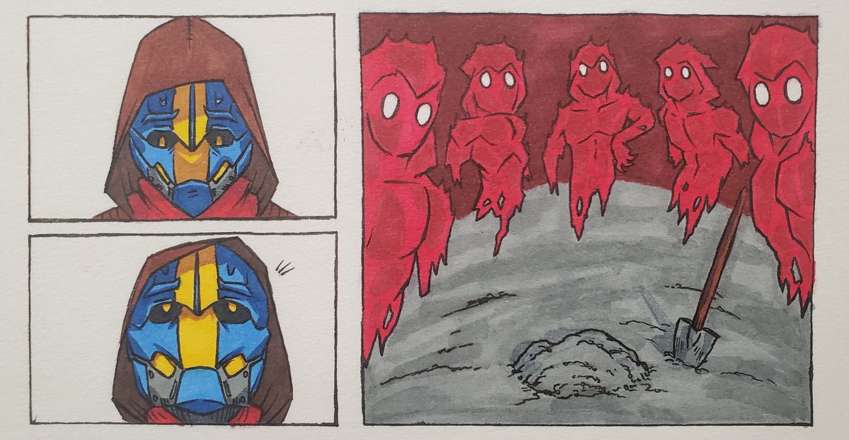 #Inktober Day 14: Empty Pixel on the battlegrounds of Luna during the Great Disaster, clutching the cloak of a fallen friend. He'd carry it with him always. #Destiny2Art