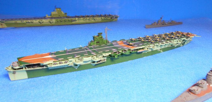 #今月作ったプラモ晒そうぜ 今月は何とか目算通り #タミヤ の空母「大鳳」を完成させました。なお、インストとは異なり“もし捷号作戦に参加していたら…”というif仕様です😀 残業続きで新しい画像を用意できなかったので、ピンぼけ気味のボツ画像で失礼💦 twitter.com/Say42125007/…