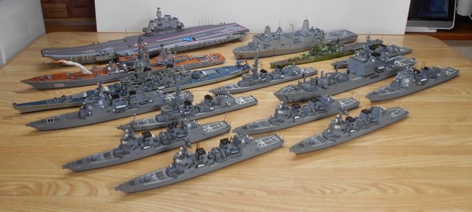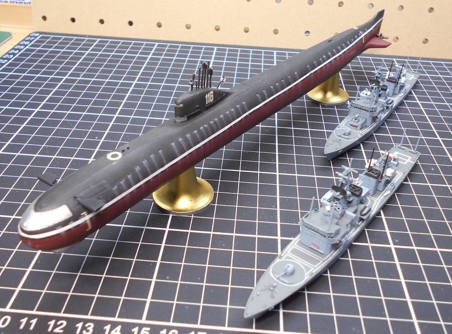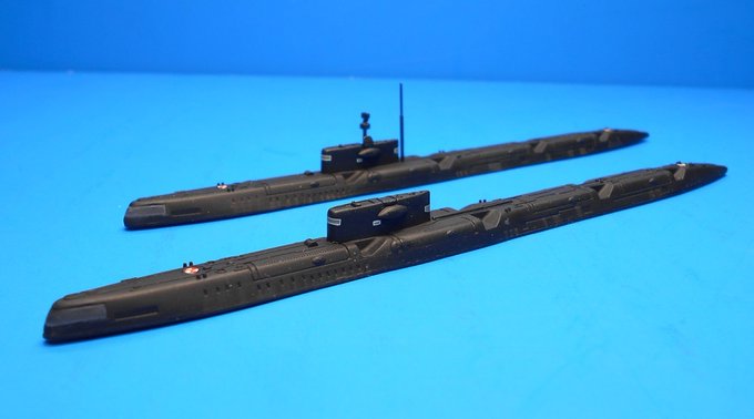 #今月作ったプラモ晒そうぜ 今月はFLAGMAN「1/350 ソビエト原子力潜水艦ノーベンバー級」から【627A型】を、ハセガワ「1/700 護衛艦 おおよど&せんだい」から【あぶくま型:標準型&RAM装備型】を製作しました。 やはり1/350は場所を食うなぁ…😖 5月からタミヤ「翔鶴」を使ってIf艦やります。