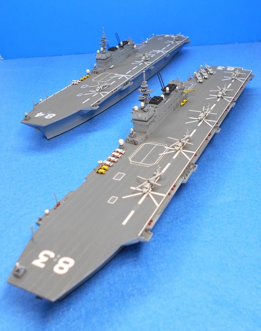 #今月作ったプラモ晒そうぜ 今回はハセガワ1/700 護衛艦「いずも」と「かが」を製作しました 実は「いずも」を2つ購入してしまい、「かが」のRランナーを取寄せての製作です 更に製作中に艦載機ランナーを紛失し、車両とSH-60はアオシマ、MCH-101はピット製を使ってます 最初から最後までグダグダ😅