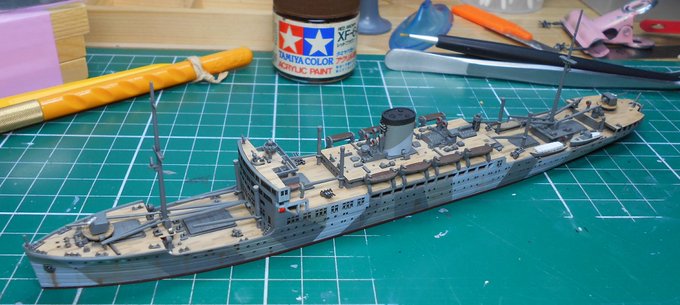 #今月作ったプラモ晒そうぜ ハセガワ1/700特設潜水母艦「平安丸」 撮影スペース用意する時間がないので、明晩に改めて報告します。 #今月完成しなかったプラモ晒そうぜ FLAGMAN 1/350 ソ連原潜「K-118」 喫水線付近の白線に時間かかりそうだったので平安丸に注力しました。 よし、フロ入って寝る💤