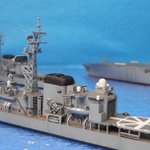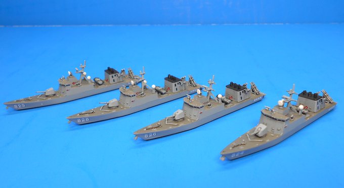 #今月作ったプラモ晒そうぜ ピットロード 1/700 「あさかぜ」「さわかぜ」。前者は初版キットに現行“たちかぜ”の部品を使用、後者は部品取りしたキットから製作しました。 令和の今、昭和生まれの護衛艦を平成頃の状態で製作ししました。主砲と補給ポスト、衛星通信アンテナ等を3DP製に換装しています