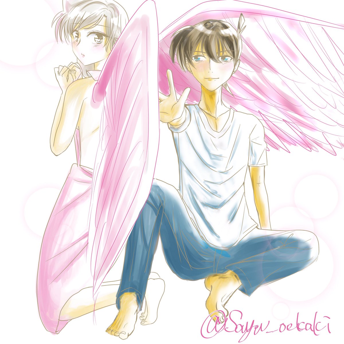 #リプをもらった番号の色を使って絵を描く #新蘭 配色は番号は23番のエンゼルフィッシュです (グリザイユ塗りなんで指定の色だけど色変わっちゃてますが) なんだろ... 天使の羽に手を伸ばしてさわろーとしてる新一と天使な蘭?