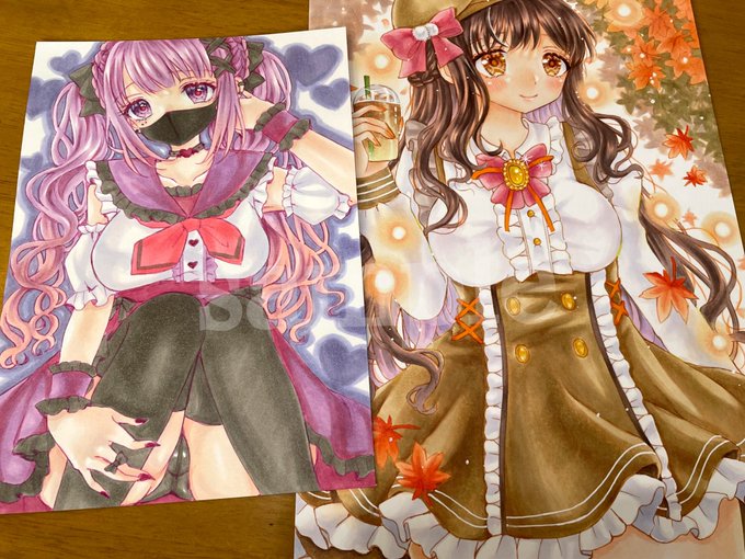 秋イラストと地雷系女子ちゃん完成🙌✨ 地雷ちゃんは買った紙を試したくて描いた🤔✨ #イラスト #コピック