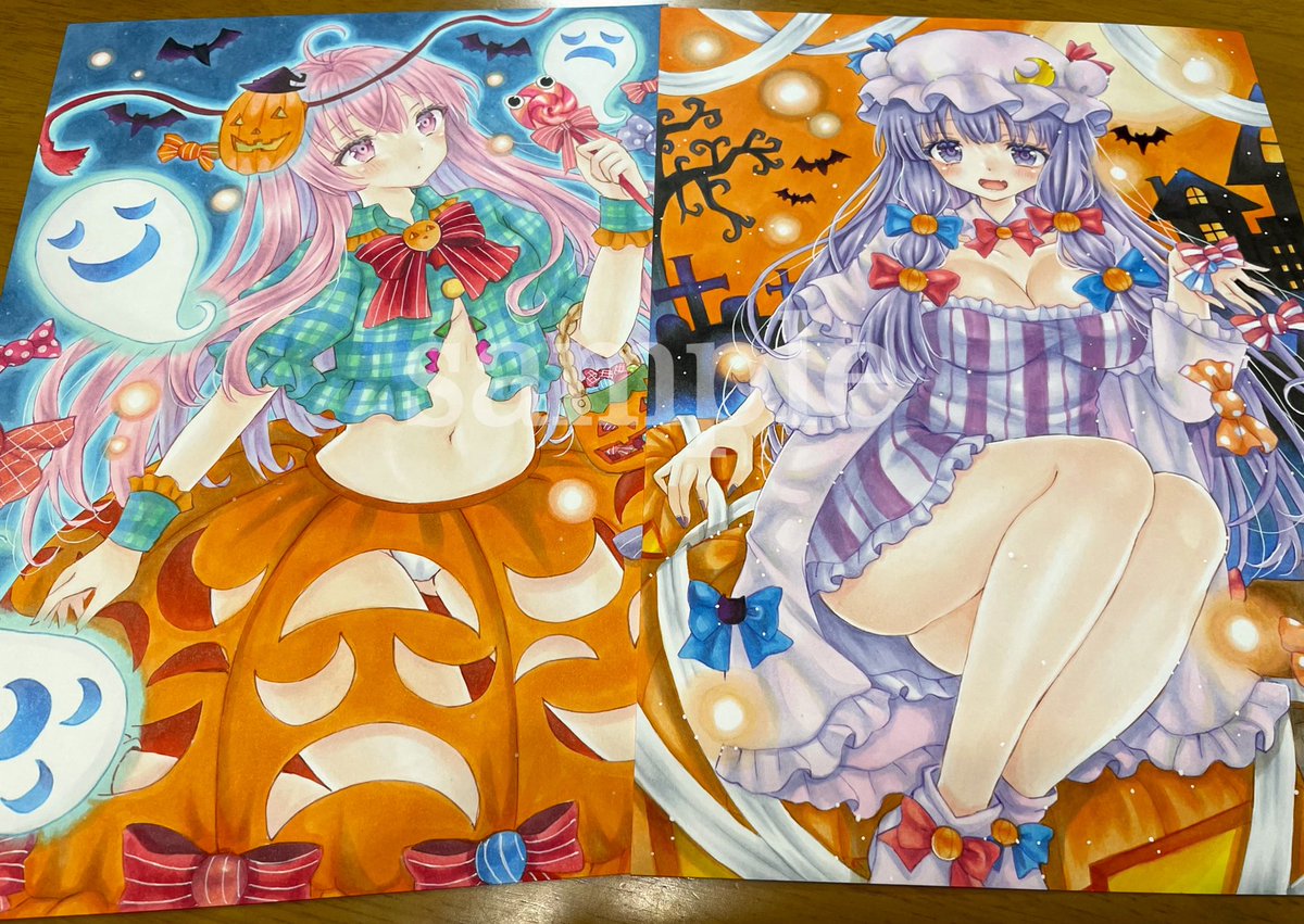 こんな夜中にやっと完成😅💦 今回時間かかりすぎていろいろ忙しくて途中絵上げるの忘れてた😇笑 東方projectのハロウィンイラスト🎃 こころちゃんとパチュリーちゃん🙌✨ つぎでラストハロウィンイラストの予定🌸 #イラスト #コピック