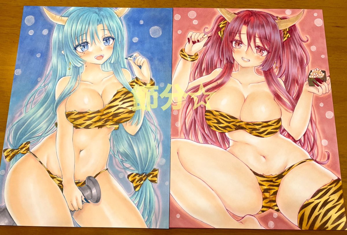 節分イラストどちらも完成🙌 青鬼ちゃんはバタバタしたから少し荒くなってしまった🙄 ギリギリだな…今回反省点は少し目を盛りすぎた🤣笑 自分自身メイク好きだからついまつ毛を描きすぎたりアイシャドウみたいに色いれすぎて遊びすぎた😇😇 #イラスト #コピック