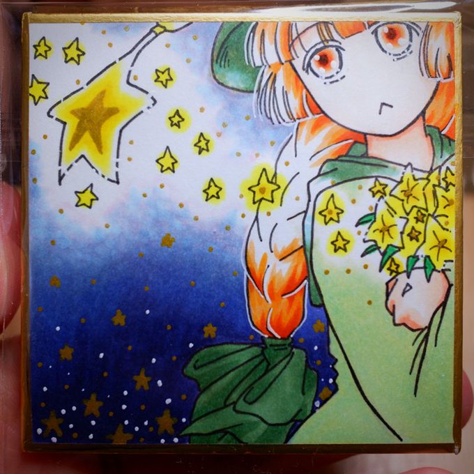 #アナログ絵師の本気を見せてみろ AI対策でGlazeかけてるからうねうねしててごめんね。 人物と下の空の濃紺はコピックだよ! 黄色ベースのお星さまは全部アクリルで一発描きだよ! シェルリンプレーンの紙がとてもキラキラしてきれいなので、印刷意識して余白多めです。