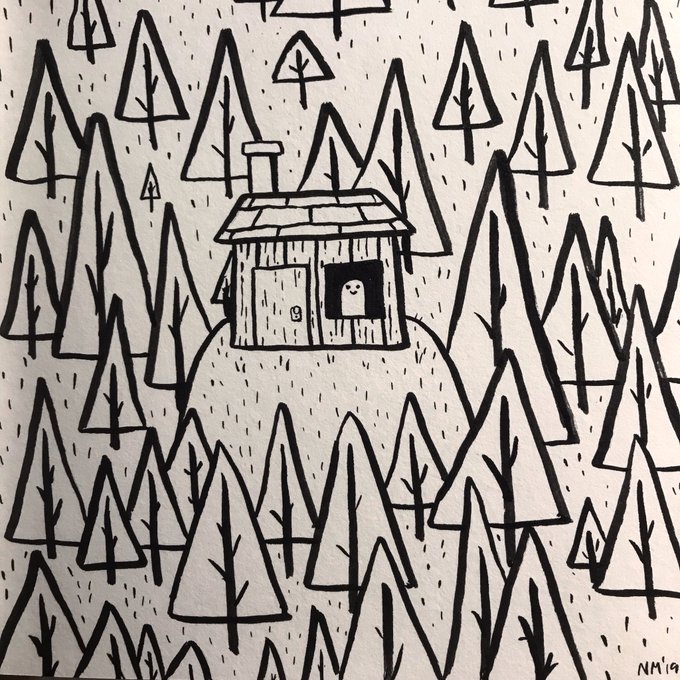 A happy ghost in a tiny cabin on a hill in the woods. #inktober #inktober2019 #ghost #cabin #woods #forest #trees #ink #tombow #illustration #pittsburghillustrators