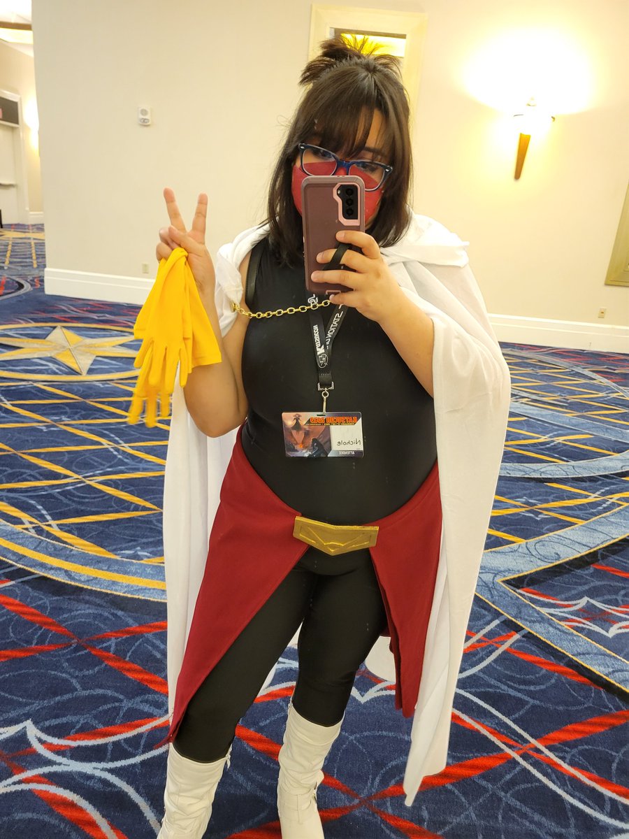 I'm so bad at posting here but, I'm at #Katsucon this weekend! Friday was Nana Shimura from MHA I made the waist cape and emblem myself, and sewed the chains and buttons on cape! Hair is mine cause forgot my wig! #cosplay#MHA#mhacosplay#katsu2023#katsucon2023