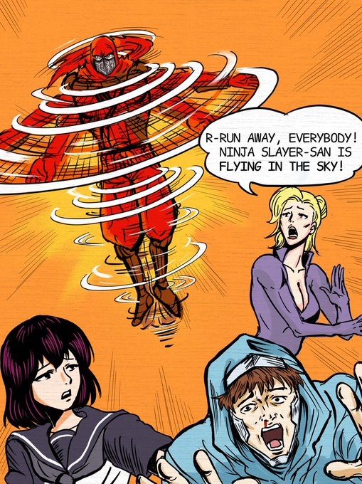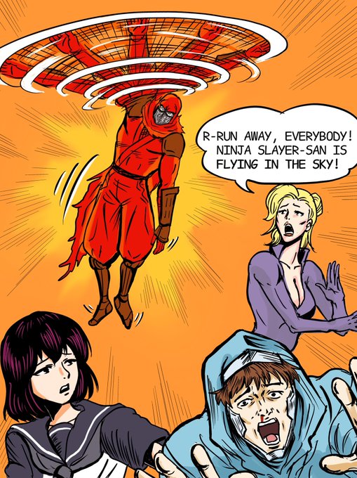片腕をヘリコプターの羽根のようにまっすぐ伸ばし、回転の力で飛ぶニンジャスレイヤー=サンを念写しました #ウキヨエ #ニンジャスレイヤー twitter.com/njslyr/status/…