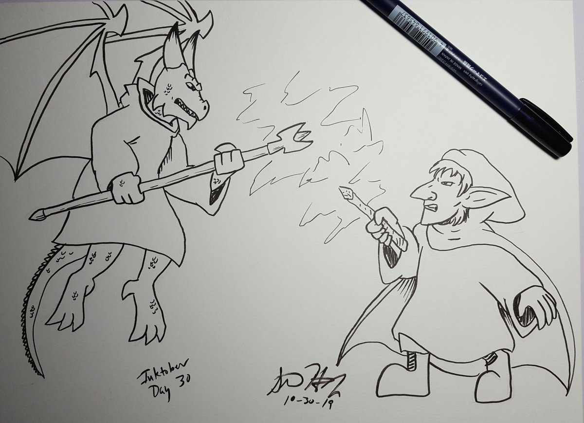 #Inktober Day 30. The battle between the kobolds and goblins continues with the wizards entering into magical duel. #inktoberday30 #Inktober2019 #Inktober2019day30 #dnd #dndart #DnDcharacter #kobold #goblin #dungeonsanddragons #wizard