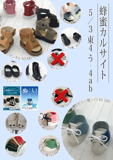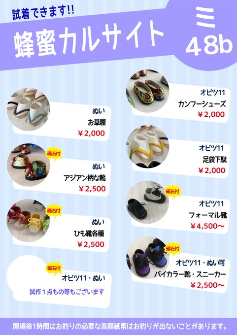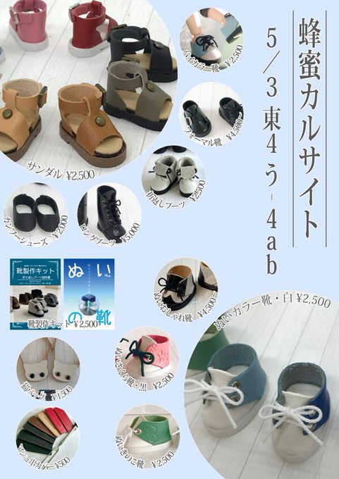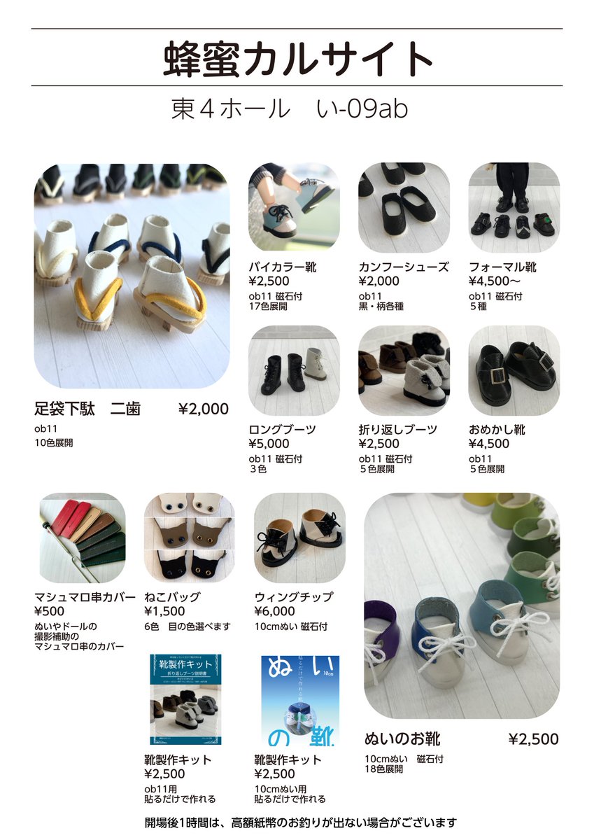 #夏コミ #C100 14日(日)東ユ-11a 蜂蜜カルサイト お品書きです。 オビツ11(ピコP/ピコドー/キューポッシュ/YMY)と、10cmぬいのお靴を持っていきます。BOOTHのページの色展開を参考にしてください。サンダル白は革の到着が遅れているため、今回は持って行けません。 patricia.booth.pm