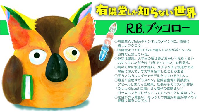 最近、老舗書店有隣堂さんのYouTubeチャンネル #有隣堂しか知らない世界 ばっか見てる。文房具や特殊紙やインクの名前やプロレス雑誌に萌える人は是非見てほしいなぁ。笑えるよ。 #ブッコローイラスト #YouTubeで使用してOK #イラスト #店員も個性派揃い